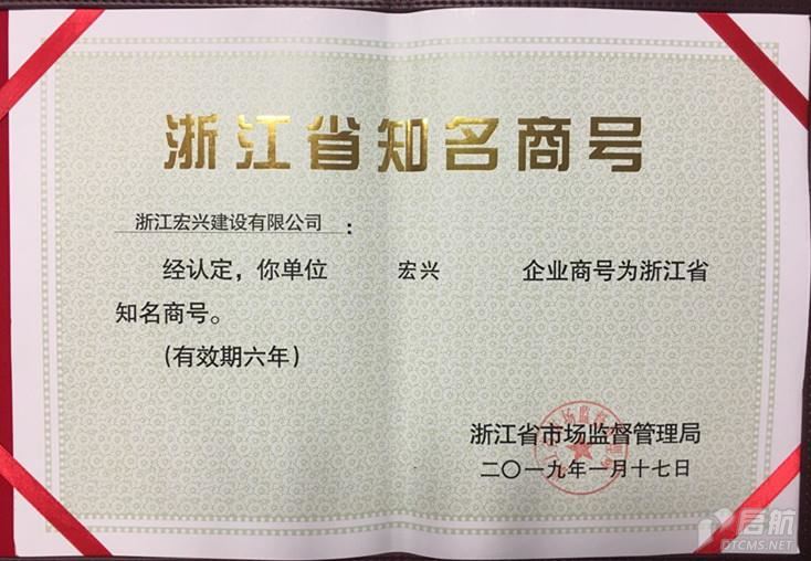 近日,公司收到了來自浙江省市場監督管理局頒發的,浙江省知名商號證書。公司“宏興”商號喜獲2018年度浙江省知名商號